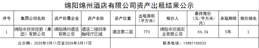 绵阳绵州酒店有限公司资产出租结果公示