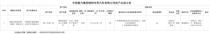 中国重汽集团绵阳专用汽车有限公司资产出租公告