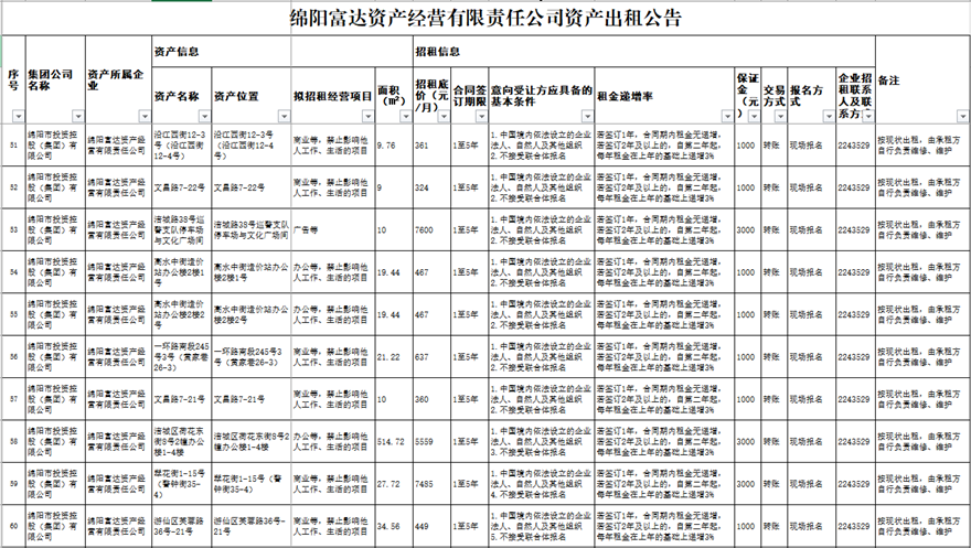 绵阳富达资产经营有限责任公司资产出租公告