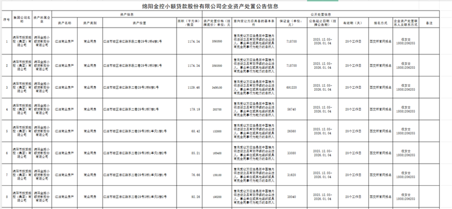 绵阳金控小额贷款股份有限公司企业资产处置公告信息