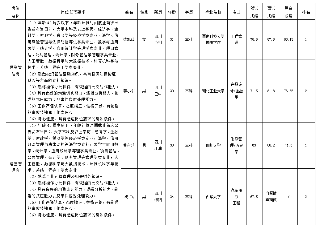 根据绵阳市投资控股(集团)有限公司发布的招聘公告及招聘相关规定,经笔试、面试等程序,现将笔试(面试)成绩予以公示。