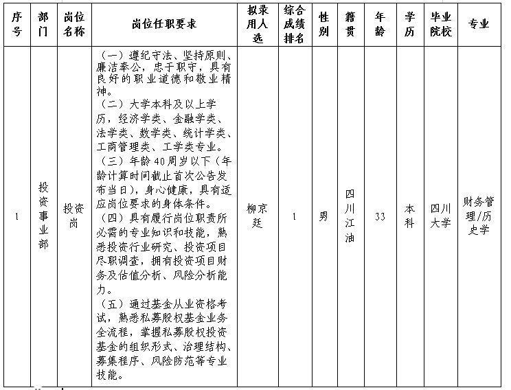根据绵阳PP电子平台私募基金管理有限公司发布的招聘公告及招聘相关规定,经笔试、面试、背调等程序,拟录用柳京廷同志到绵阳PP电子平台私募基金管理有限公司工作,现予以公示,具体情况如下: