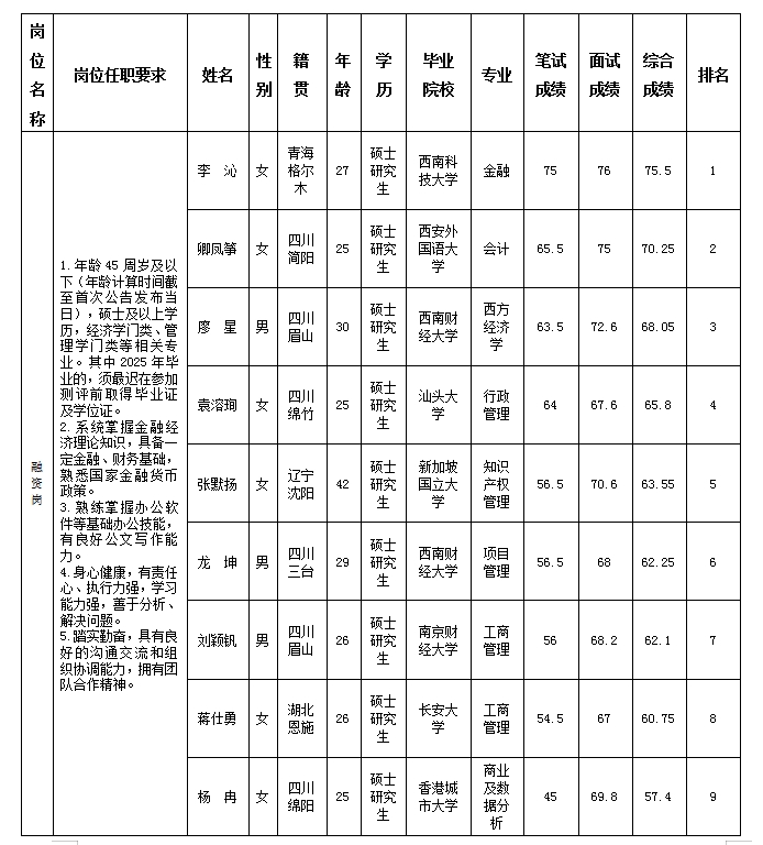 【公开招聘】绵阳金控投资管理有限责任公司关于招聘融资岗测试成绩的公示