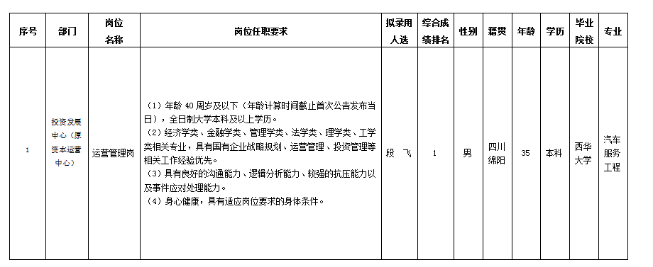 根据绵阳市投资控股(集团)有限公司发布的招聘公告及招聘相关规定,经笔试、面试、背调等程序,拟录用段飞同志到绵阳市投资控股(集团)有限公司工作,现予以公示,具体情况如下: